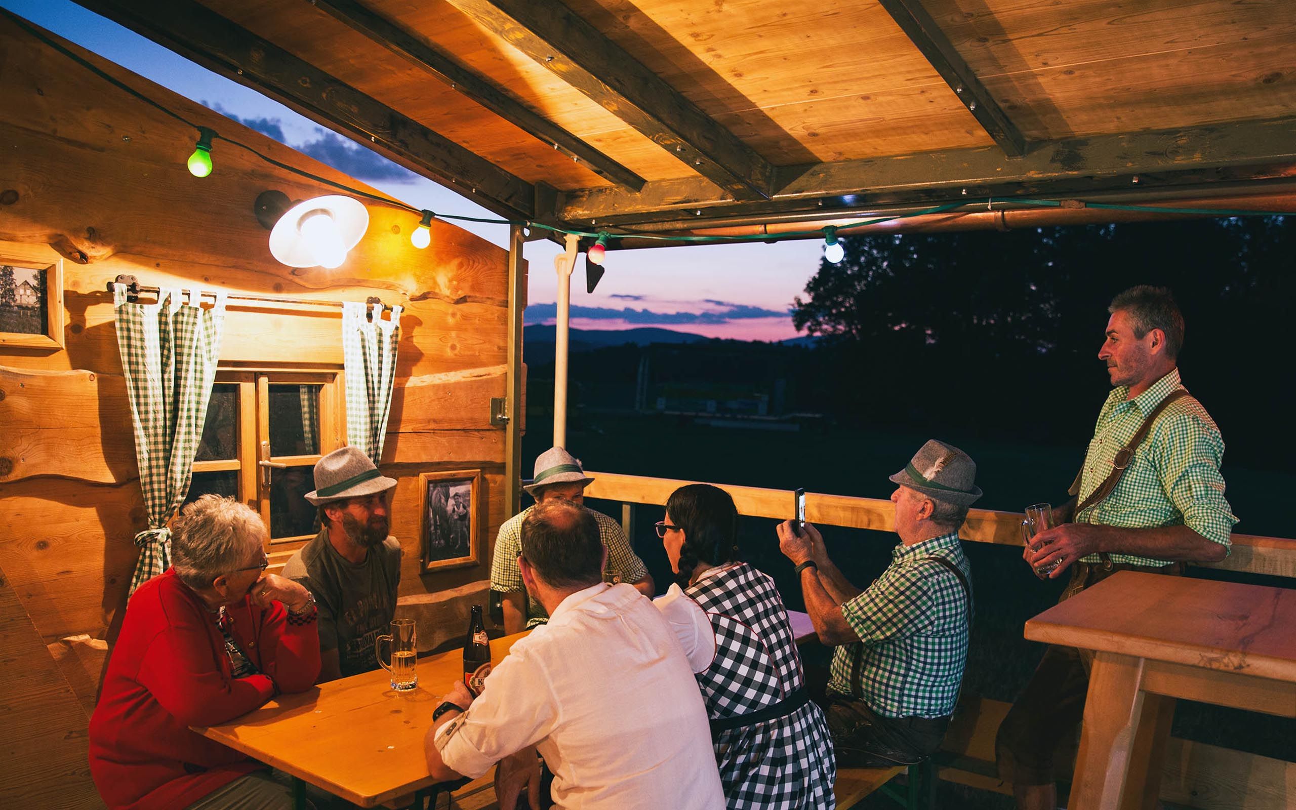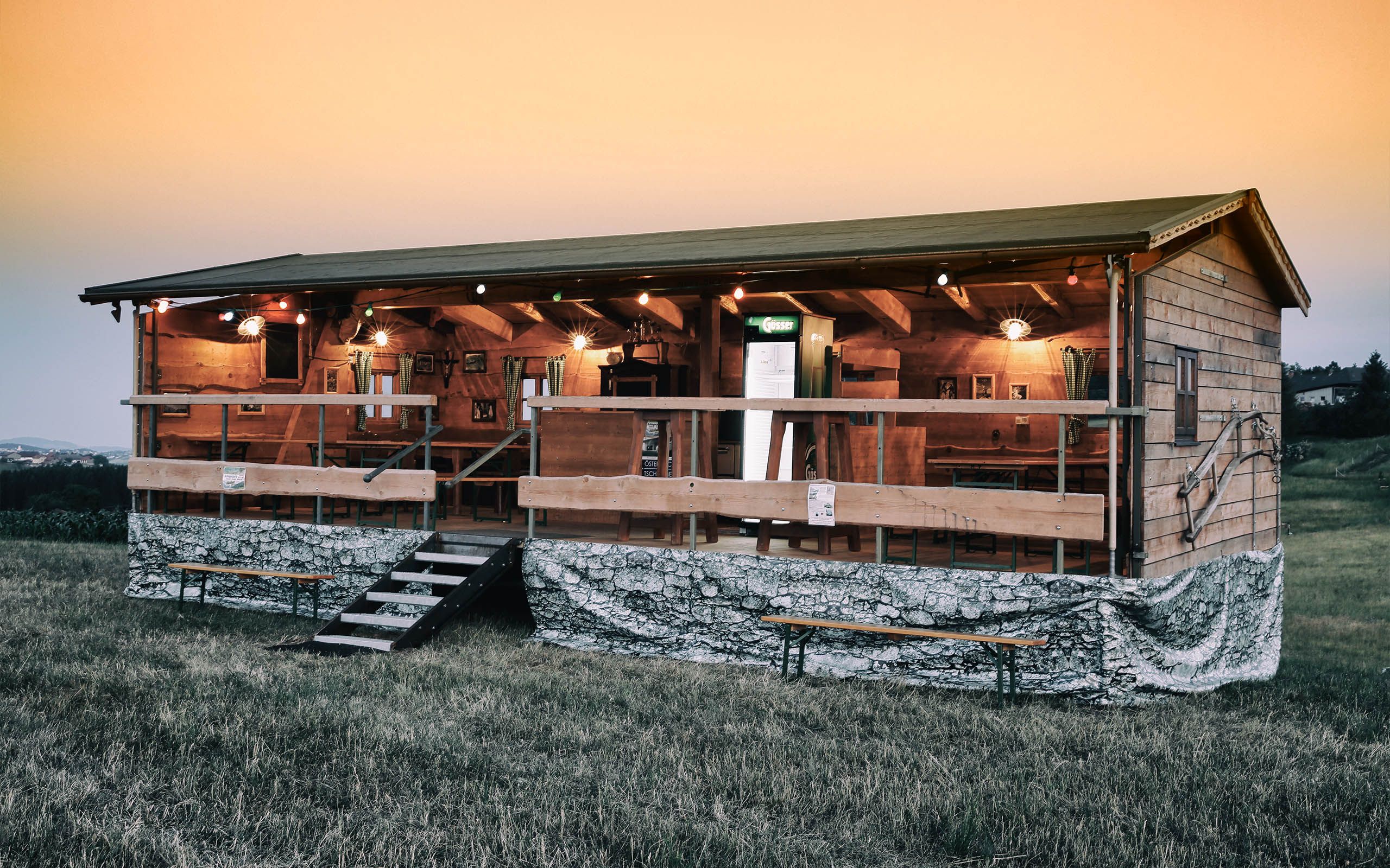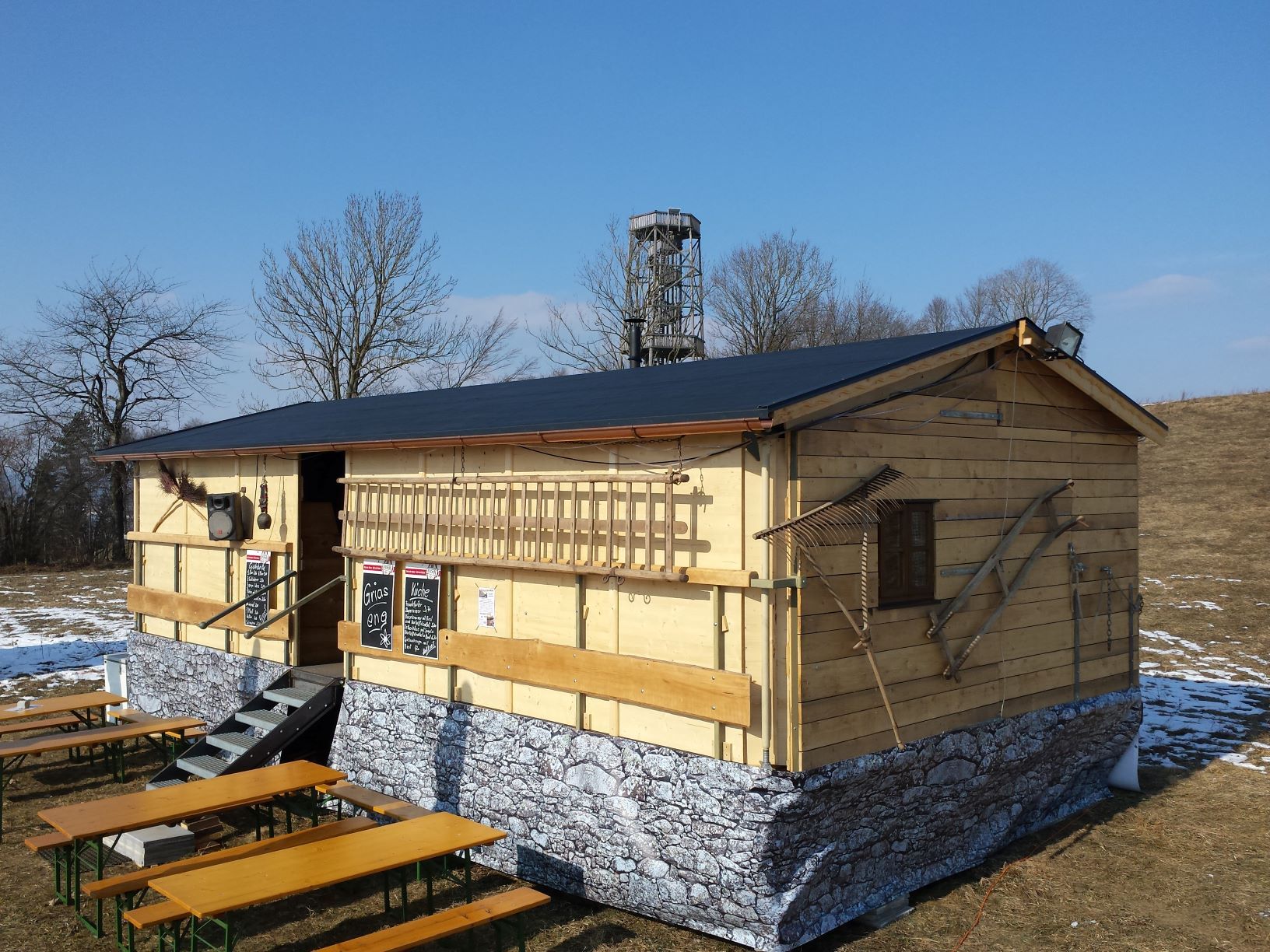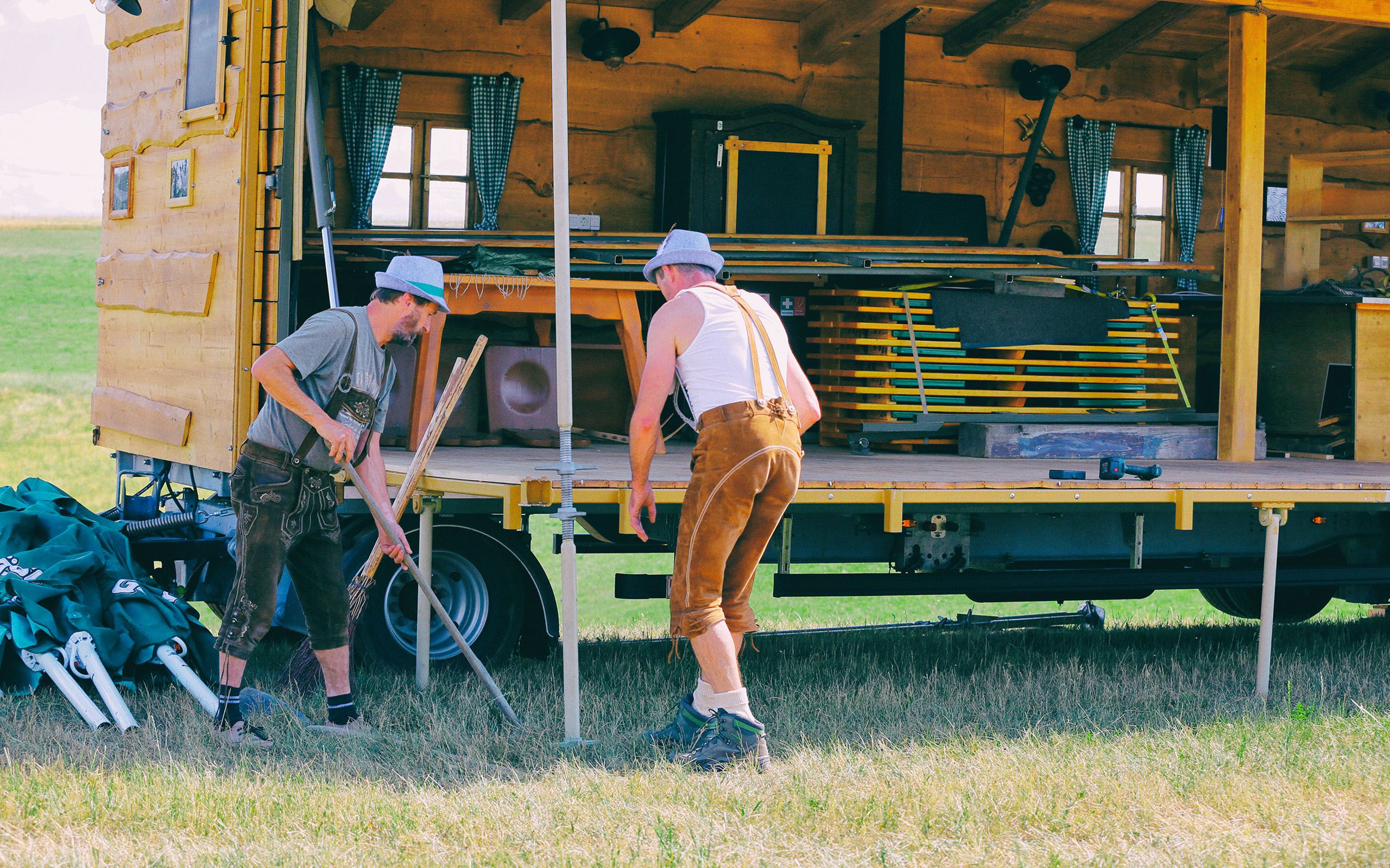 Wir vermieten die mobile "Almhütte" und das "Hexenhäusl" sowie Markise, Schirme für Beschattung, WC und Notstromaggregat uvm. In einer Hütte haben bis zu 70 Personen Platz. Die mobilen Hütten können Sommer wie Winter genutzt werden, auch für Freiluft-Theater oder als Bühne, wobei das Dach nach außen hin hochgeklappt wird und dabei eine Längsseite geöffnet ist.
